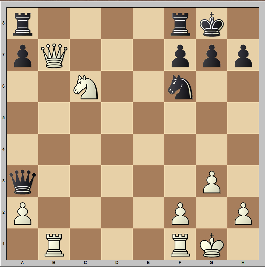 The answer is a killer 28.Nb8!! It shuts off the rooks and Black’s a8-rook is trapped. Please note that taking on b8 will force Black to give up his queen with …Qf8 due to back-rank issues. Black had to give up an exchange, and eventually lost.