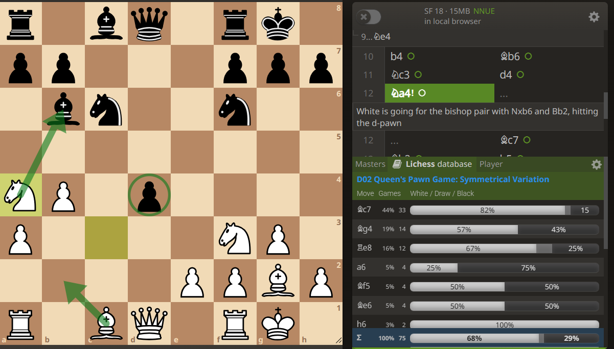 The top move 12…Bc7 scores a whopping 82% win rate for us! I’ll take it :)